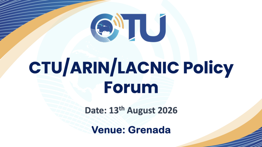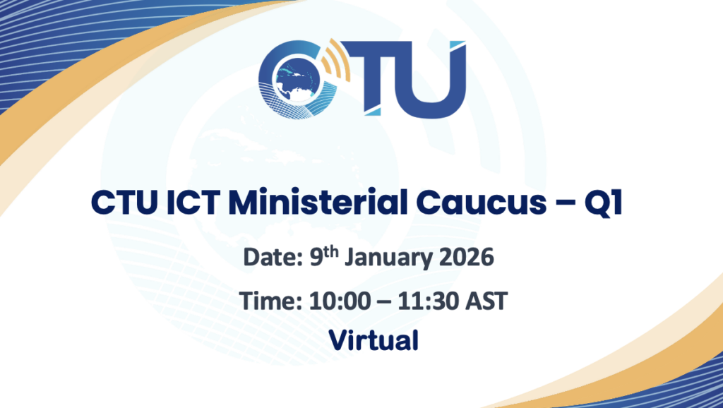 CTU Events 2025 ICT Calendar of Events 2026 ICT Calendar of Events Toggle List View Upcoming Events CTU ICT Ministerial Caucus – Q1 Date: January 9, 2026 Venue: Virtual 2026 1st International ICT Forecast and Industry Watch Meeting Date: January 9, 2026 Venue: Virtual CTU/EULAC Webinar Data Embassies for Caribbean Digital Resilience Date: January 16, 2026 Venue: Virtual CTU 1st Caribbean Preparatory Meeting for WTPF 2026 Date: January 16, 2026 Venue: Virtual Spectrum Management Task Force Meeting and Workshop Date: February 10, 2026 - February 11, 2026 Venue: Virtual 54th Executive Council Meeting Date: March 17, 2026 Venue: Virtual CTU 1st ITU Plenipotentiary (PP26) Prep Meeting Date: March 27, 2026 Venue: Virtual CTU ICT Ministerial Caucus – Q2 Date: March 31, 2026 Venue: Virtual CTU 2026 2nd International ICT Forecast and Industry Watch Meeting Date: March 31, 2026 Venue: Virtual CTU 2nd Caribbean Preparatory Meeting for WTPF 2026 Date: April 10, 2026 Venue: Virtual CTU’S International Girls in ICT Day Webinar Date: April 23, 2026 Venue: Virtual CTU 37th Anniversary Celebration Date: April 28, 2026 Venue: Trinidad and Tobago CTU One Digital Caribbean Scorecard Technical Workshop Date: April 29, 2026 - April 30, 2026 Venue: TDB Spectrum Management Task Force Meeting Date: May 20, 2026 - May 21, 2026 Venue: Virtual CTU’s 3rd International ICT Forecast and Preparatory Meeting Date: June 22, 2026 Venue: Virtual CTU Cybersecurity Webinar Date: August 5, 2026 Venue: Virtual 5th Caribbean Youth Internet Governance Forum Date: August 12, 2026 Venue: Grenada 22nd Caribbean Internet Governance Forum Date: August 12, 2026 - August 14, 2026 Venue: Grenada CTU/ARIN/LACNIC Policy Forum Date: August 13, 2026 Venue: Grenada Spectrum Management Task Force Meeting Date: August 26, 2026 - August 27, 2026 Venue: Virtual CTU ICT Ministerial Briefing – Pre ICT Week Date: September 4, 2026 Venue: TDB CTU ICT Week 2026 – French Guiana Date: September 14, 2026 - September 18, 2026 Venue: French Guiana Spectrum Management Task Force and Workshop Date: November 4, 2026 - November 5, 2026 Venue: Virtual Past Events
